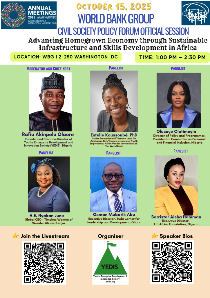 Exciting news! The full video of the Youths Enterprise Development and Innovation Society (YEDIS) official session is now available on the World Bank website. The session, “Advancing Homegrown Economy through Sustainable Infrastructure and Skills Development in Africa”, was moderated by YEDIS Executive Director, Rafiu Akinpelu Olaore, during the World Bank and International Monetary Fund Civil […]