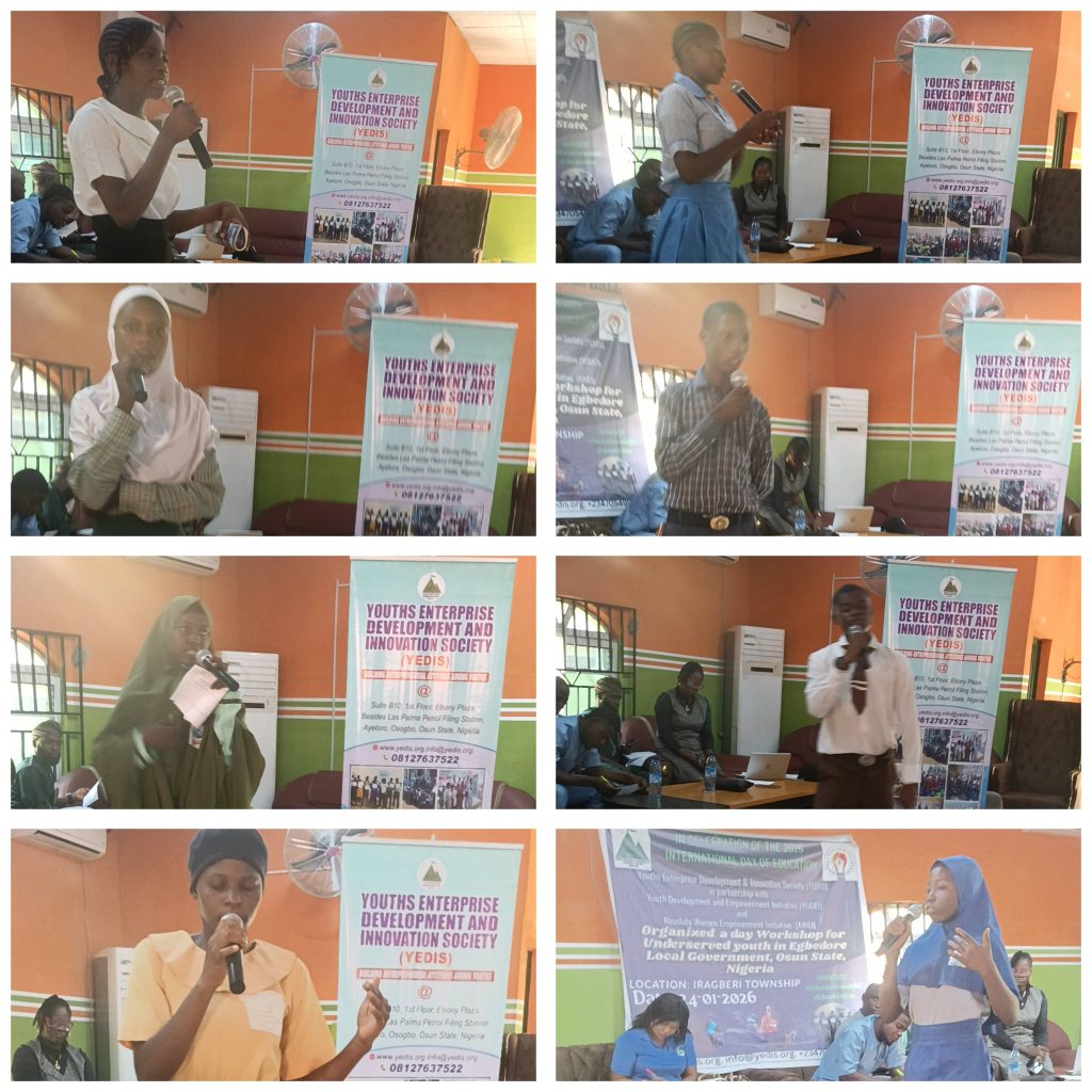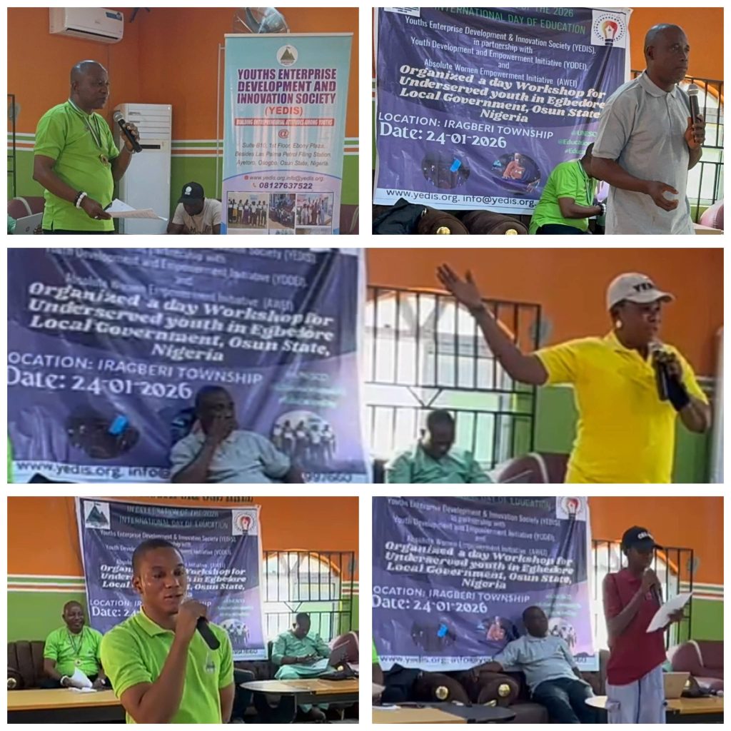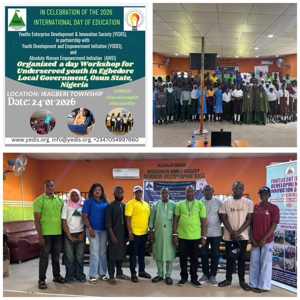 The Youths Enterprise Development and Innovation Society (YEDIS), in collaboration with the Youth Development and Empowerment Initiative (YODEI) and the Absolute Women Empowerment Initiative (AWEI), celebrated International Day of Education in Iragberi township, Egbedore Local Government, Osun State, Nigeria, on 24 January 2026. The event was notably inclusive, with participation from over 500 students from villages and towns within Egbedore Local Government. The program commenced at 9:00 a.m. and concluded at 5:00 p.m.